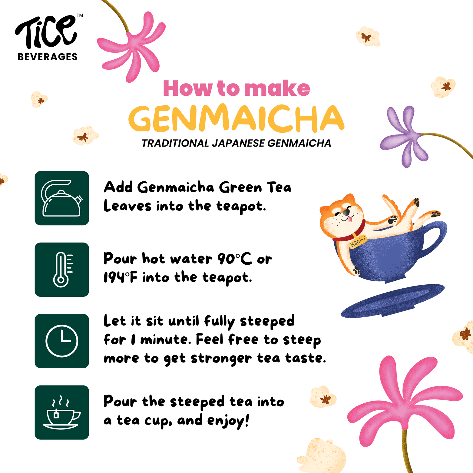 Bring home the calming and unique flavor of Japanese Genmaicha Green Tea, brought to you by Tice Beverages. Sip, relax, and embrace the wellness of traditional Japanese tea culture.